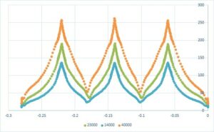 عدد ناسلت با توجه به میزان دمای بدست آمده در خط پایین صفحه U شکل در مرکز آن در جهت X و دمای مربوط به آن به دست می آید. با تغییر سرعت ورودی جت برخورد میتوان عدد رینولدز را تغییر داد و با سه عدد رینولدز 23000، 14000 و 40000 عدد ناسلت را بررسی کردیم. Nu=hk/L=hLk شکل زیر نموداری از عدد ناسلت را در این شبیه سازی بر حسب اعداد رینولدز مختلف نشان می دهد.